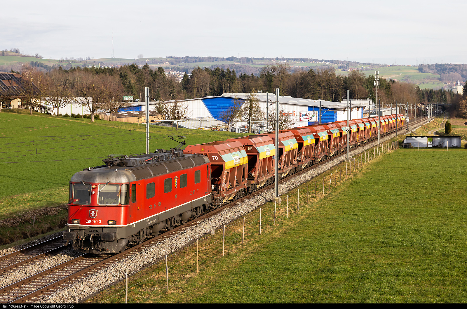 | Re 620 # 070 (Re 6/6 # 11670) "Affoltern am Albis" of the SBB pulls the empty "Weiacher Kies" gravel train 67830 from Rothenburg Station via Olten-Brugg-Regensdorf-Bülach to Zweidlen, between Sursee and St.Erhard-Knutwil. |