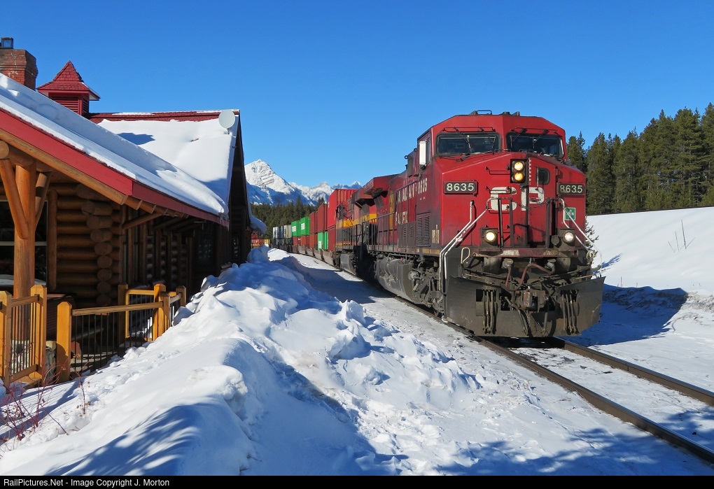 | CP 8635 leads train 112 east passed the old railway station at Lake Louise. Some words of caution if you plan on taking a photo here. The train passes fairly close to the boarding platform. The wind current generated by the train can throw your balance off a bit. I always try to take a few steps to the side before the train passes me. |