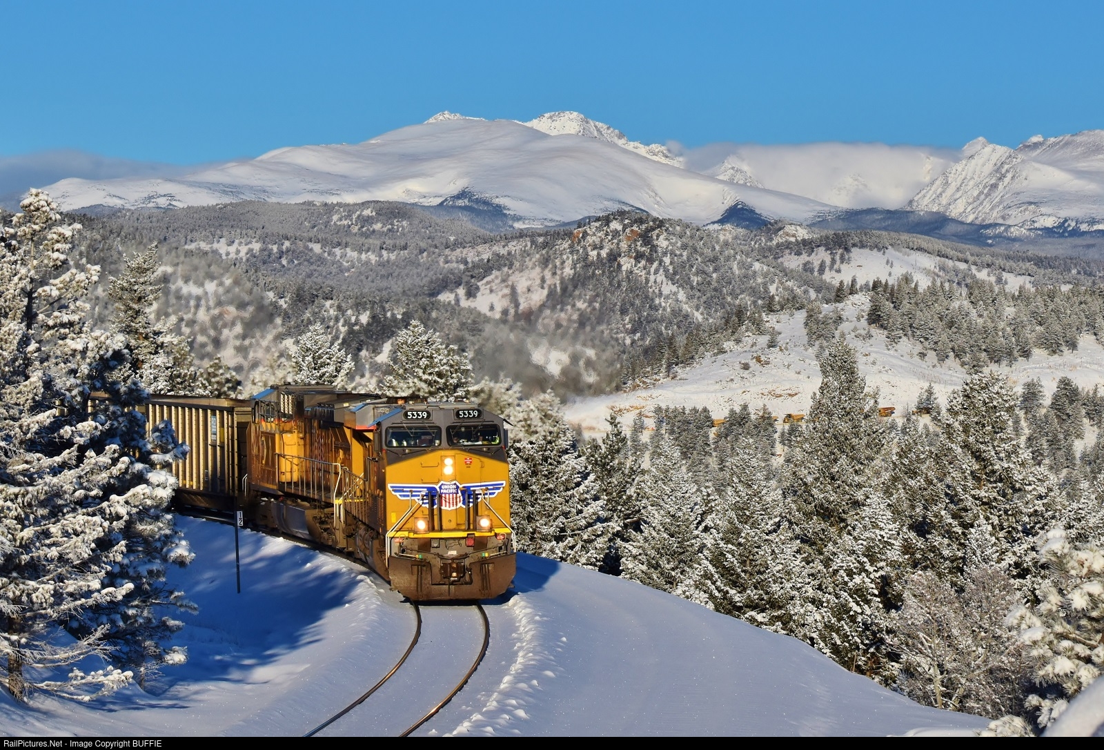 UP 5339 (ES44AC) leads freight through Crescent, Colorado on a beautiful sunny day with snow on the Rocky Mountains.