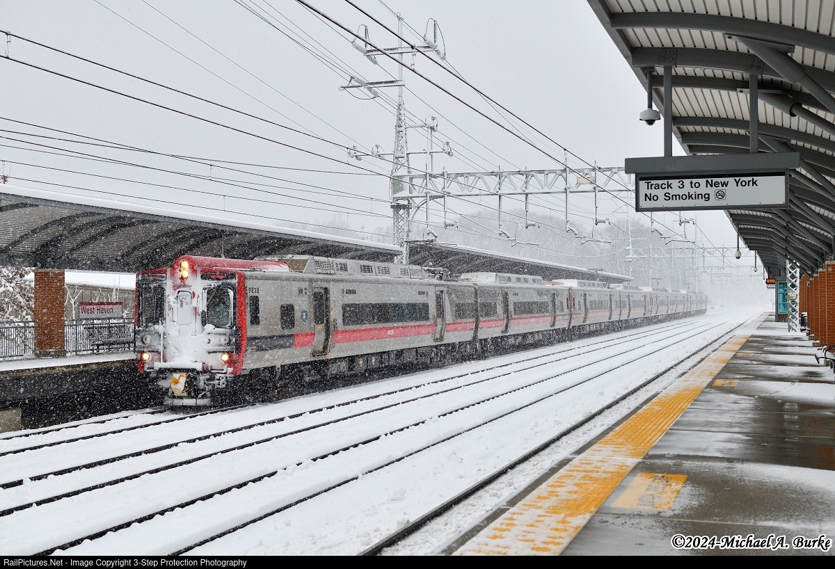 The snow flies as train 6514 from New York City arrives at West Haven Station.