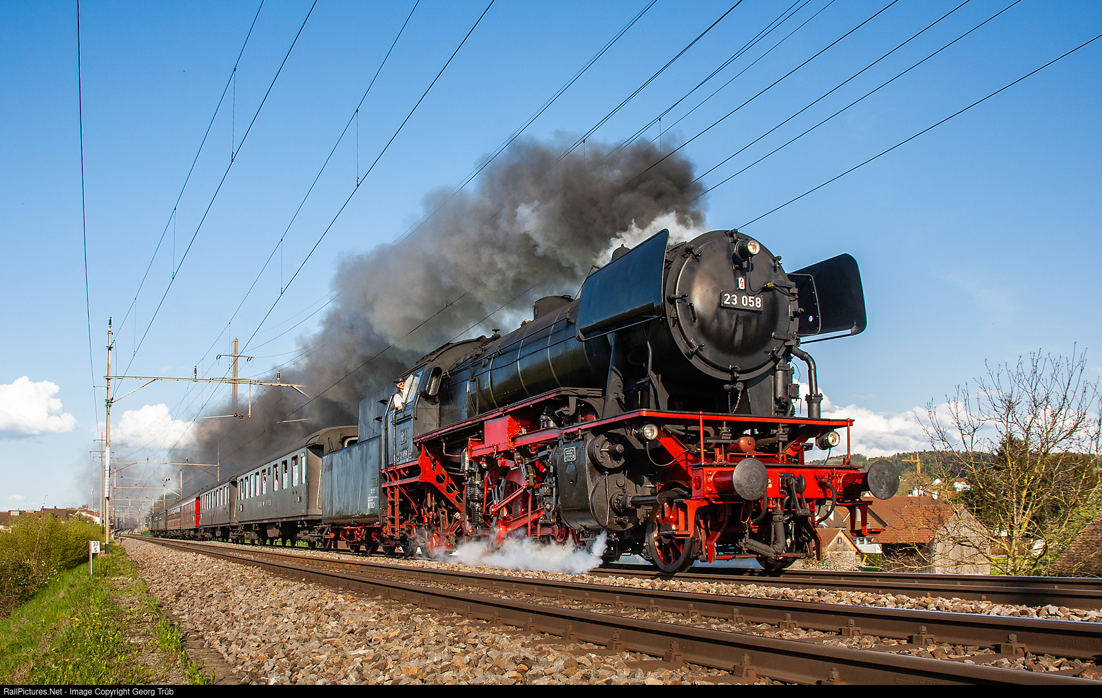 | Former Deutsche Bundesbahn 2-6-2 passenger steamlocomotive 23 # 058, now running for the association EUROVAPOR, based then in Haltingen near Basel (today in Würzburg), with the "Nostalgie Rhein Express" on the way back from the second "Arbon Classics" event, tackling the 1.2 % grade from Frauenfeld up to Rickenbach-Attikon with full speed near Islikon. The engine was built by Krupp/Essen in 1955. |