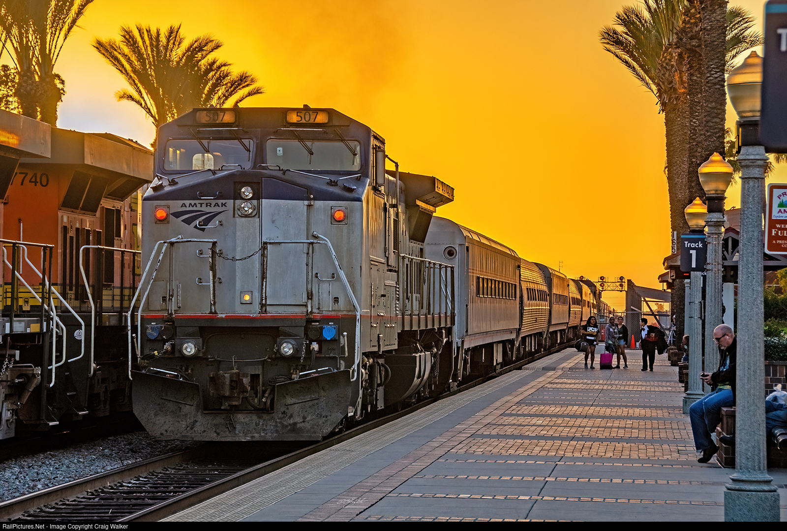 A high green signal allows Amtrak Pacific Surfliner 583, with a mix of Amfleet and Horizon Fleet cars, to depart Fullerton as the sun sets in the west. This train, heading to Los Angeles from San Diego, is running 25 minutes behind schedule. Amtrak Non-Powered Control Unit (NPCU) 90208 (ex-F40PH 208) leads this train, with AMTK Dash 8-32BWH 507 shoving on the rear. Meanwhile, on Track 2 of the BNSF San Bernardino Sub is eastbound BNSF freight M-WATBAR1-24A (with BNSF 7772 leading), held so this Surfliner could cross over to Track 1 ahead of it before it continues its trip from Watson Yard (in Wilmington CA) to Barstow CA. (Fullerton, California – February 24, 2012)