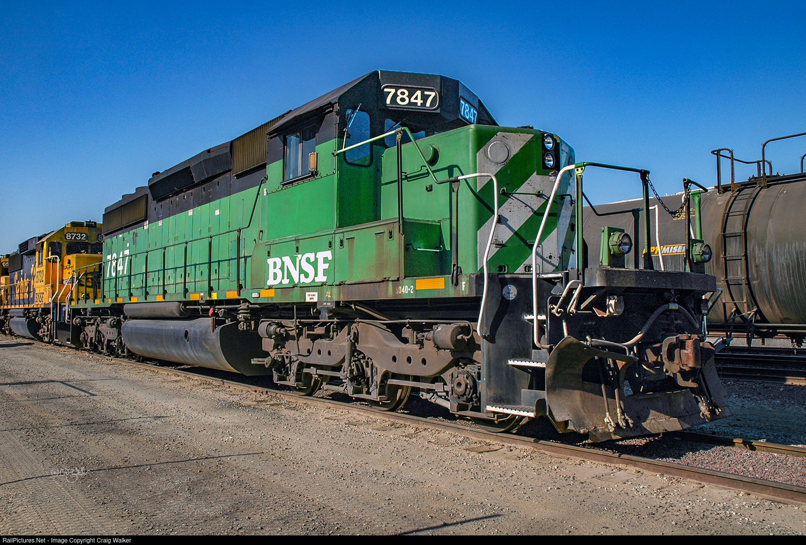 Several patched diesels sit in Burlington Northern Santa Fe Railway’s Watson Yard, in Los Angeles’ Wilmington neighborhood. BNSF SD40-2 7847 was built in July 1978 (27 years earlier) as Colorado & Southern 7847. In 1981, ten years after the Burlington Northern merger, the C&S (and Fort Worth & Denver) subsidiaries were officially absorbed into the BN Railroad. At that time, CS 7847 became BN 7847, an identity it had until the Burlington Northern Santa Fe merger in September 1995. Unlike most of the former Santa Fe locomotives, many of the BN diesels, such as this one, retained their BN numbers into the BNSF era. (Los Angeles, California – July 25, 2005). Photographed on railroad property with permission.