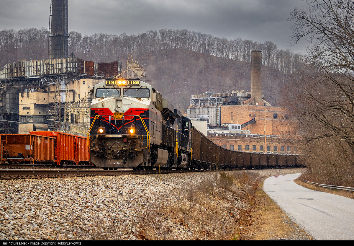 Georgia Glen: NS 8101, the Central of Georgia heritage unit, leads loaded coal train NS 762 through the industries of Glen Lyn, Virginia, as they work their way toward Narrows, VA.