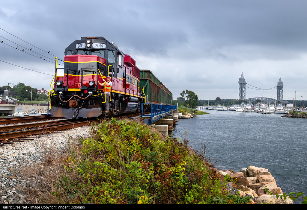 | MC 2014 with the Energy Train rolls over Cohasset Narrows in Wareham, MA and is about to go into the siding for a meet and crew swap with the dinner train. |