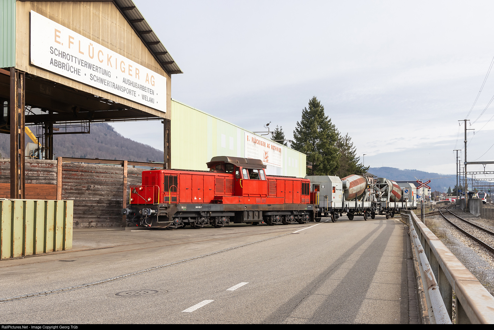 | Former SBB diesellocomotive Bm 6/6 # 18505 (98 85 5 860 505-7 CH-OeBBH), now registered with OeBBH (Oensingen-Balsthal-Bahn Historic) is crossing the street on the siding from the station area to the Flückiger compagny work place. The locomotive had to transport two old privately owned freight cars from Dagmersellen to Rothrist for scrap by the Flückiger compagny. |