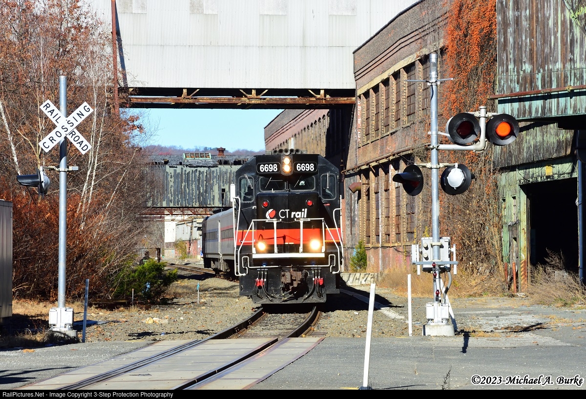 Metro-North diesel trains are led with the locomotive on the north end but occasionally they can be found leading south, opening up many photographic locations along the 27-mile Waterbury Branch. On a November morning in abundant sunshine in Ansonia, train 1957 led by leased CTrail GP40-3H 6698 passes by the derelict Farreles Factory. The Brookville BL20s are commonly plagued with mechanical issues, plus with them going out for rebuilding in Erie, PA, CTrail GP40s 6698 and 6699 fill that gap.