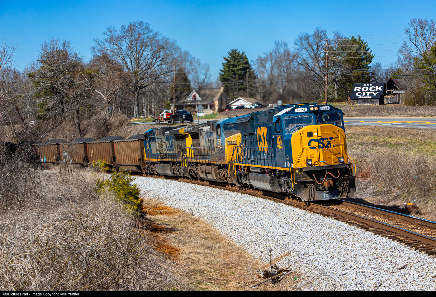 | CSX coal train C740 (Balkan to Wateree, SC) digs into the grade at Rydal, GA passing one of the many 'See Rock City' barns littered across north Georgia and southern Tennessee. |