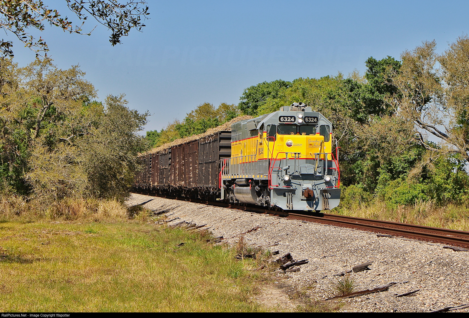 Tunnel motor, USSC 6324, leading Cane 1 back to Clewiston with 25 loaded cane cars after a trip up to Childs, the northernmost loadout on the US Sugar system.
