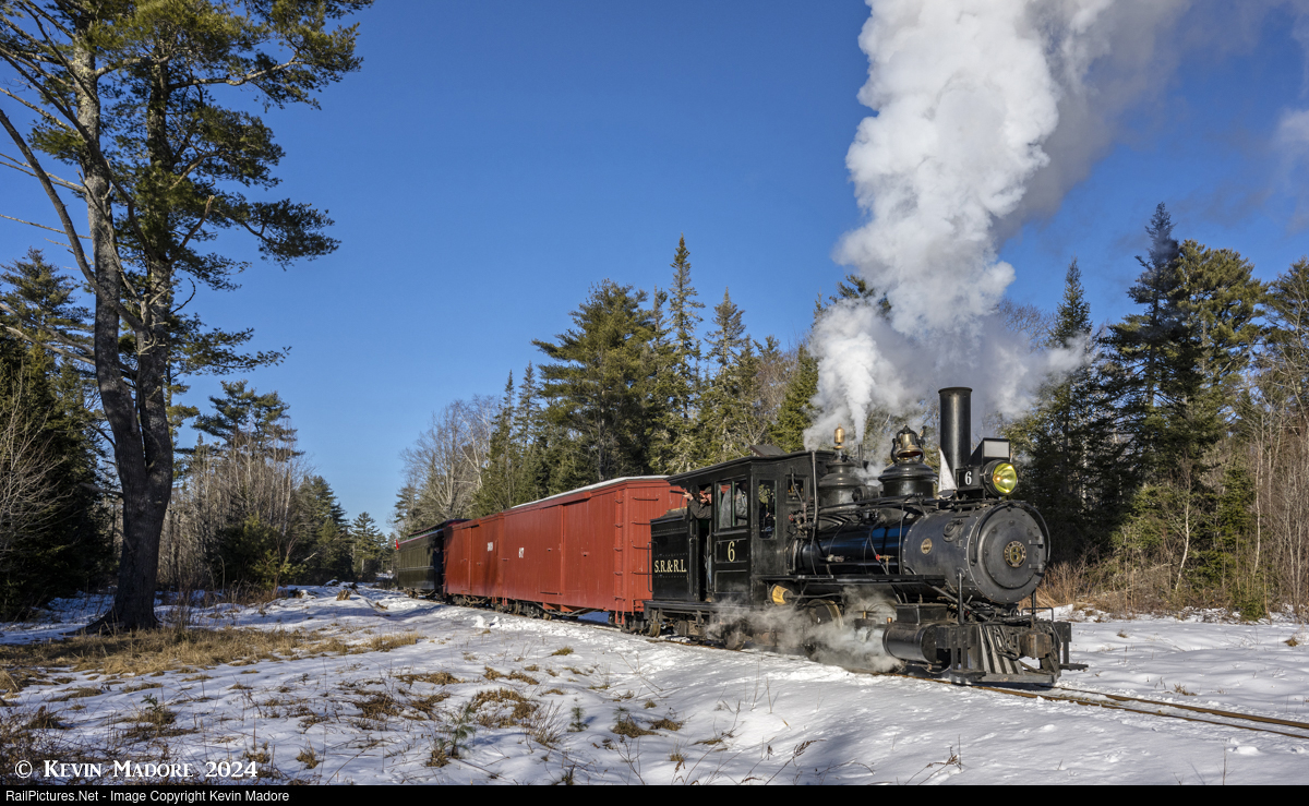 This scene was staged during a February, 2024 photo shoot on Maine's Wiscasset, Waterville & Farmington Railway Museum, which featured WW&F Locomotive #9 decorated in the livery of her very first owner, the Sandy River & Rangeley Lakes Railroad, where she carried the number 6. Trailing on the rear of the consist this day is Franklin & Megantic Coach #2. Both the engine and the coach would have run on the Sandy River back in the day. The train is shown here at the rural crossing for Rosewood Stables, not far from Milepost 7.