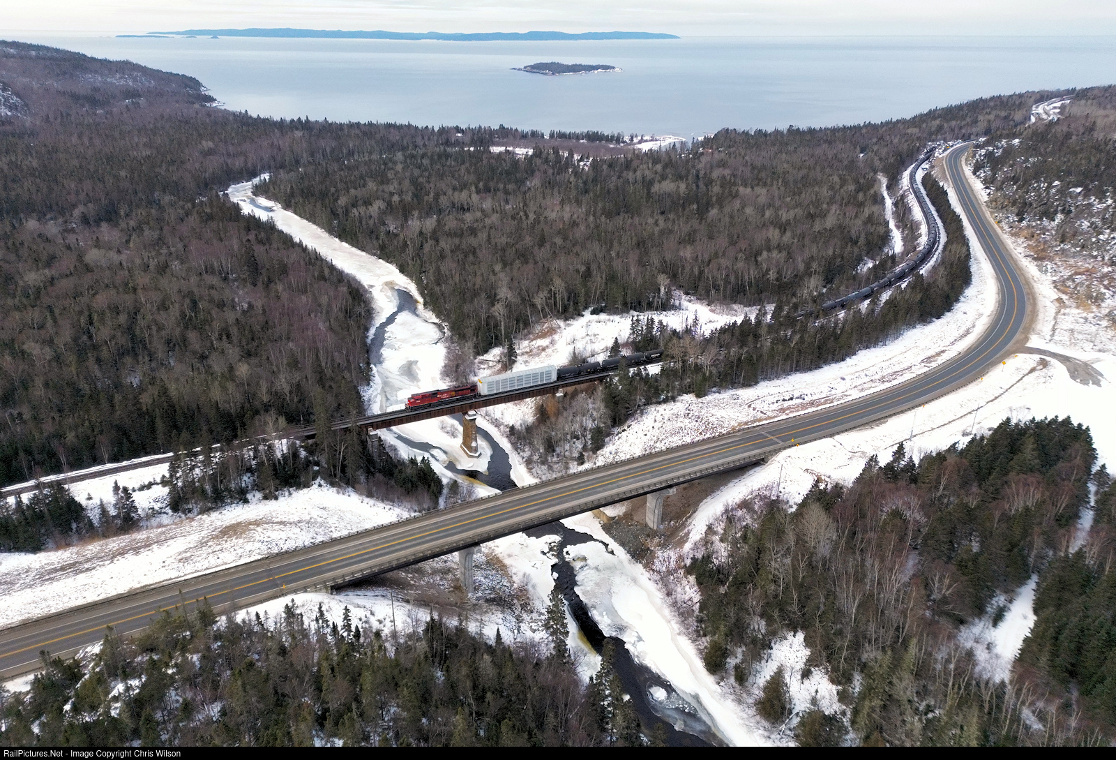 | The Trans Canada Highway and CPKC's Heron Bay Subdivision are in close proximity at the Steel River along the north shore of Lake Superior. CP 2nd 106, a reprofiled vehicle train ex North Bend, BC heads across the Steel River. The Slate Islands rise off the horizon and notice very little snow and ice thanks to El Nino 2024! |