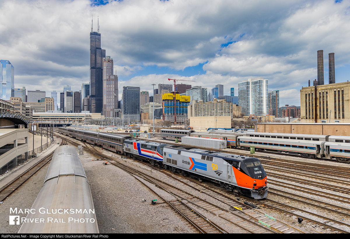 Double Your Pleasure, Double Your Fun. Amtrak Train 3 (Southwest Chief) was an on time departure as it approached Roosevelt Road in Chicago, Illinois on April 16, 2022. Leading the consist is the heritage unit duo of AMTK 161 (Phase I) and AMTK 160 (Phase III/Pepsi), both repainted for Amtrak's 50th annvirsary. The Phase I scheme is most recognizable from its application to the EMD E8s and SDP40F, the "Pepsi" scheme was only used on the GE Dash 8-32BWH. These are just two of the heritage units created by Amtrak to honor its history.