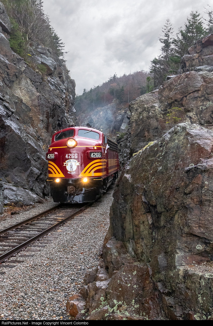 | The 470 Railroad Club's annual excursion snakes through the Gateway in Crawford Notch State Park in Carroll, NH. Leading the train is the 470's own former B&M F7s 4266 and 4268. The train is on its return trip to North Conway and will descend the old MEC Mountain Subdivision. |