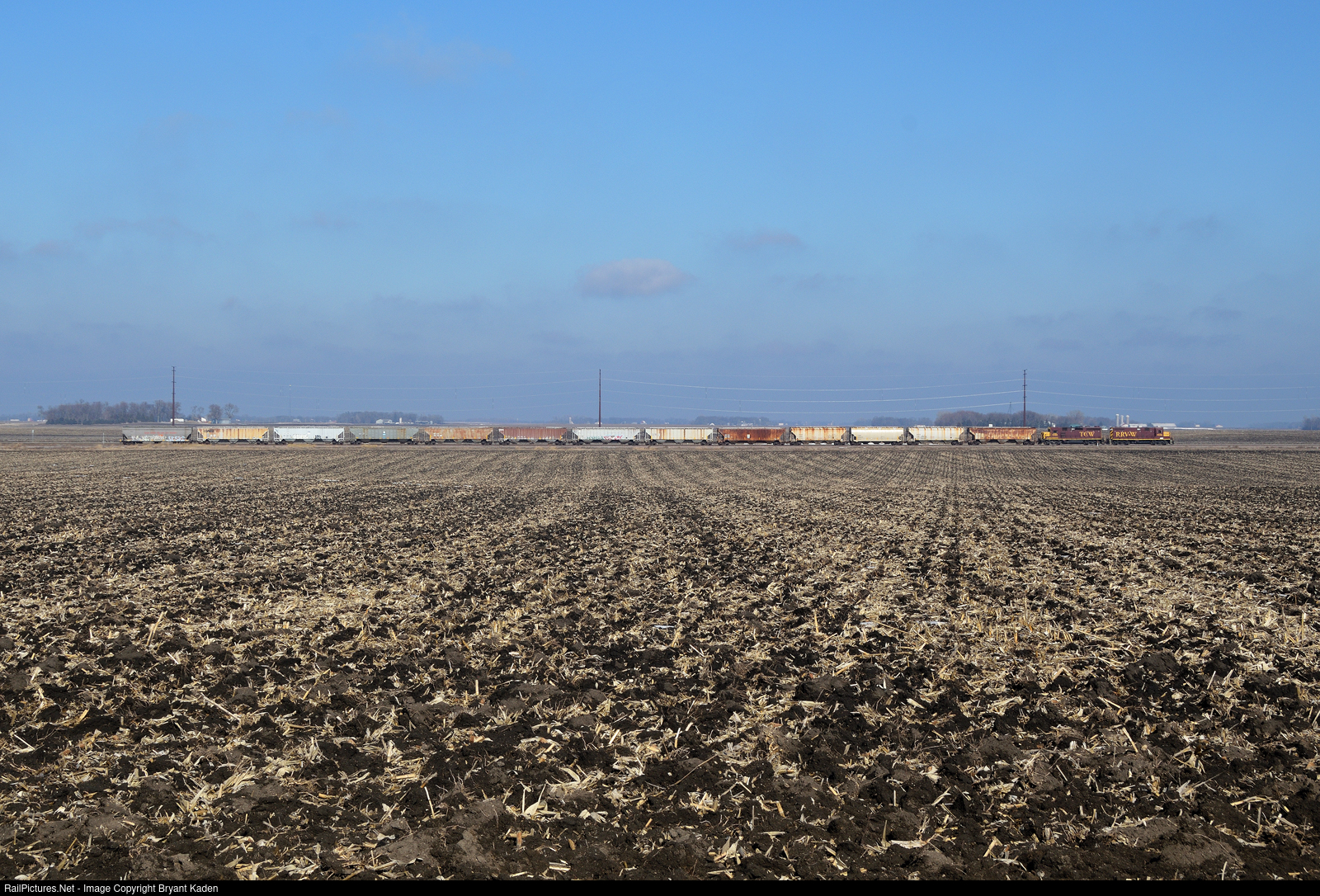 | An eastbound train rolls along the Minnesota Prairie Line between Fairfax and Gibbon. The vast and fertile farmland of west central Minnesota would normally be covered in a blanket of deep snow at this time of year, but we've had a very mild winter so far. |