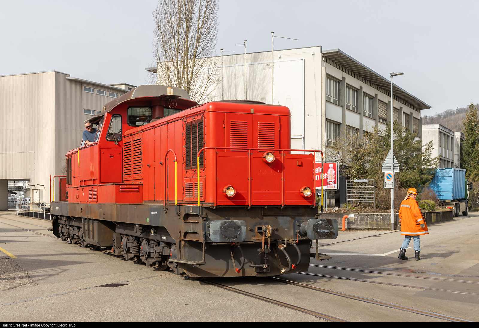 | Former SBB diesellocomotive Bm 6/6 # 18505 (98 85 5 860 505-7 CH-OeBBH), now registered with OeBBH (Oensingen-Balsthal-Bahn Historic) in the work place of the E. Flückiger AG in Rothrist. The locomotive brought two old privately owned freight cars from Dagmersellen for scrap.