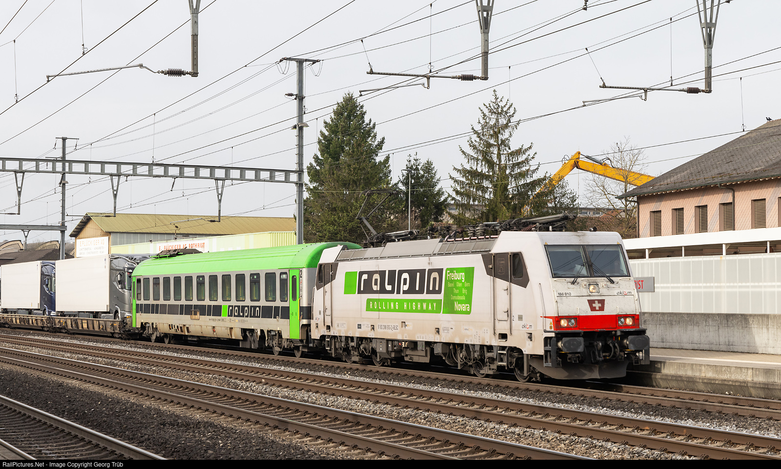 | Bombardier TRAXX 186 # 910 of the Akiem, rented to the BLS Cargo, pulls the "Rolling Highway" train 43606 of "Ralpin" from Novara via Domodossola-Simplon-Lötschberg Base Tunnel-Spiez-Olten-Basel to Freiburg im Breisgau, through Rothrist. The car behind the locomotive is a couchette car for the drivers of the loaded lorries, for rest during the journey. |