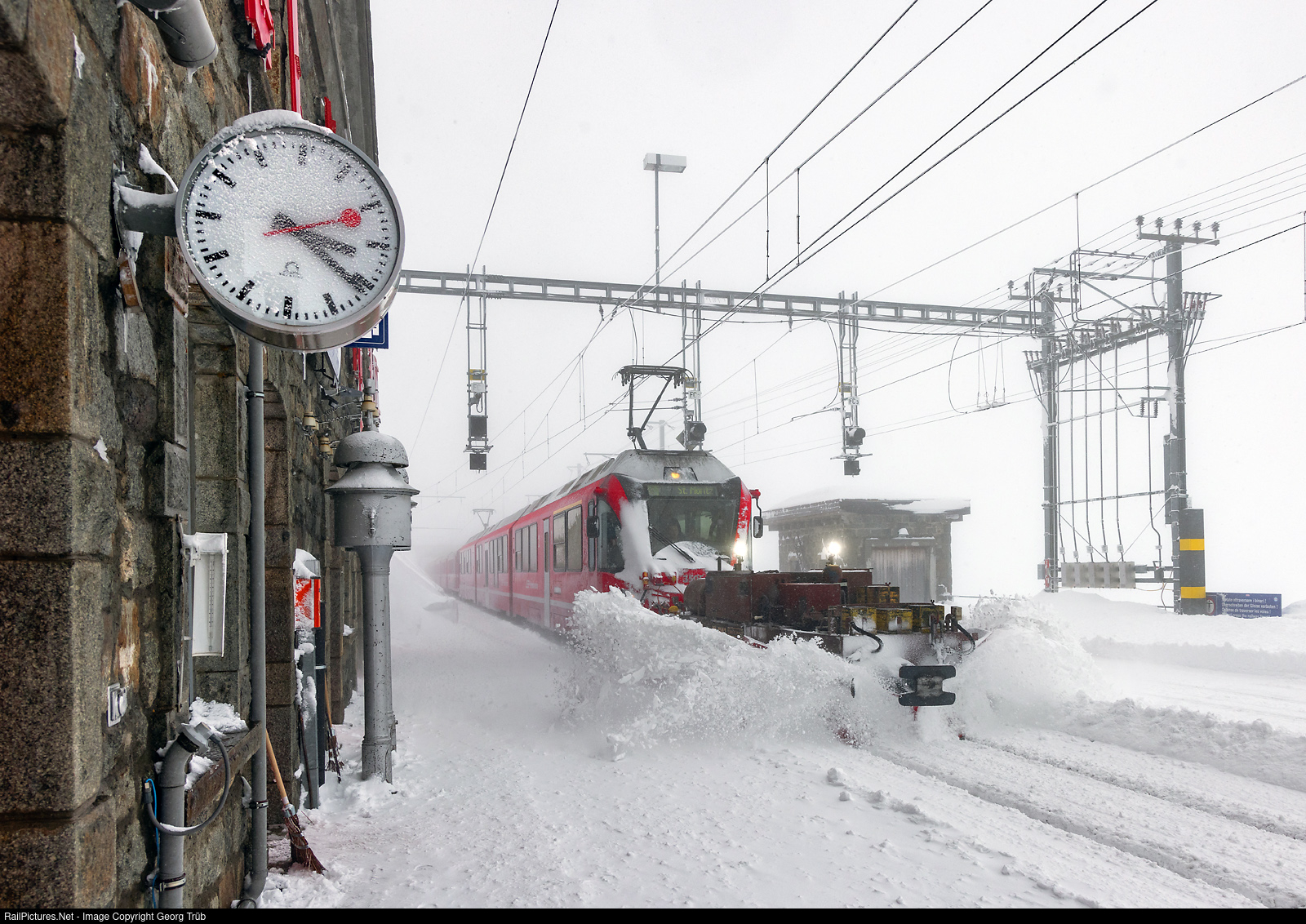 The Bernina line of the Rhaetian Railway is the highest crossing of the Alps by a railroad and is largely an open line. The highest station is Ospizio Bernina at 2253 meters above sea level. In heavy snowfall and particularly windy conditions, individual scheduled passenger trains are preceded by so-called track ploughs, which can throw snow from the track up to several centimetres below the top of the rails. These ploughs of type Xk # 9141 to # 9147 were built by Stadler between 1966 and 1988. They can be used in both directions of travel. The ploughs at the front and rear are permanently mounted, the one in the middle of the vehicle can be raised and lowered hydraulically, which is done via radio remote control from the driver's cab of the pushing traction unit. For this purpose, a railroad service employee sits next to the driver with the remote control. Regional train 4656 of line R19 from Tirano to St. Moritz with the "Allegra" ABe 8/12 # 3505 and the track plough Xk # 9143 (built 1968) arrives at Ospizio Bernina. The track plough is usually used between Poschiavo and Pontresina (or vice versa), where it is removed or placed in front.
