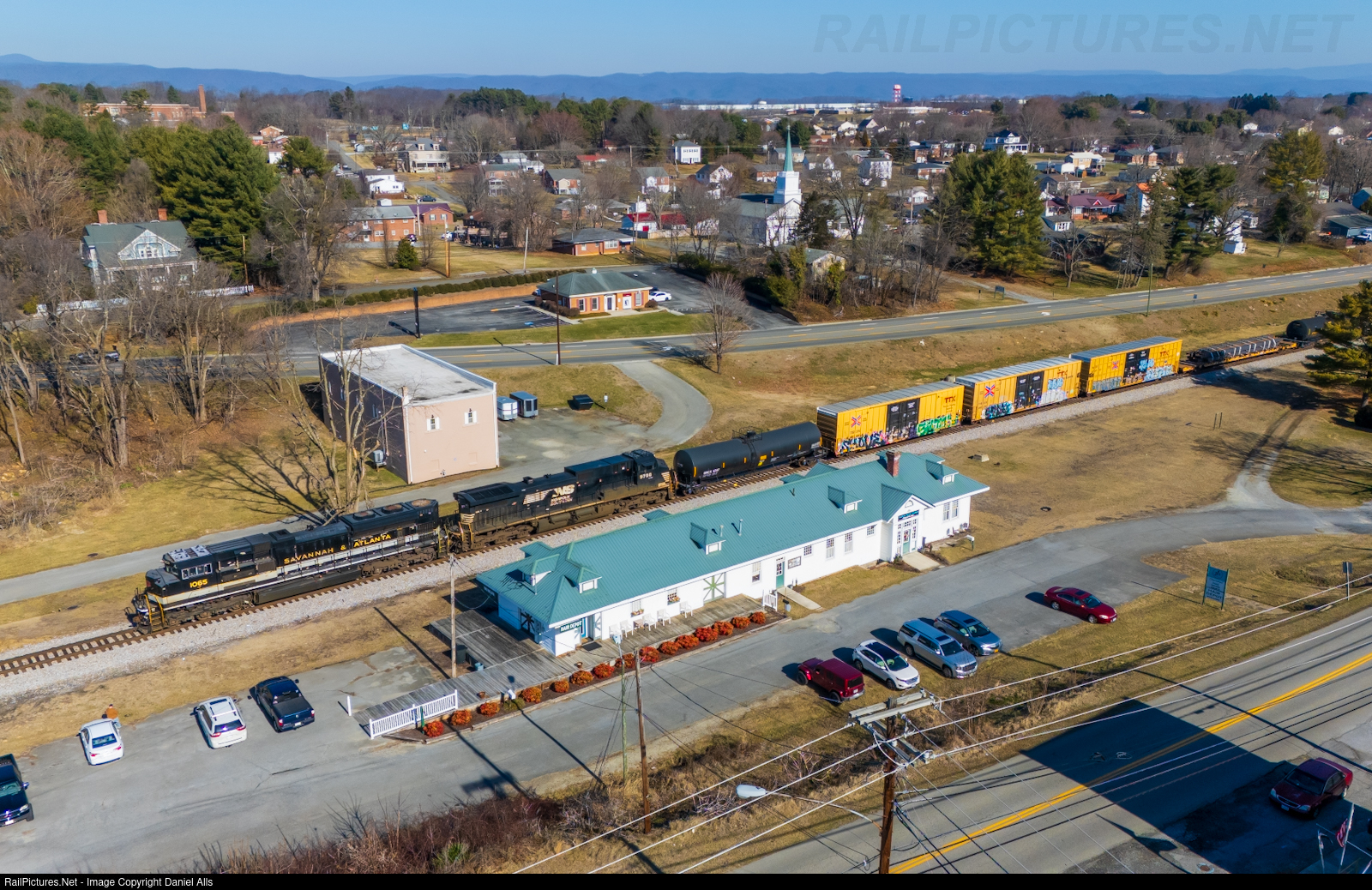 NS 127 scoots west by the Dublin depot in Dublin, VA with the Savannah and Atlanta showing the way.