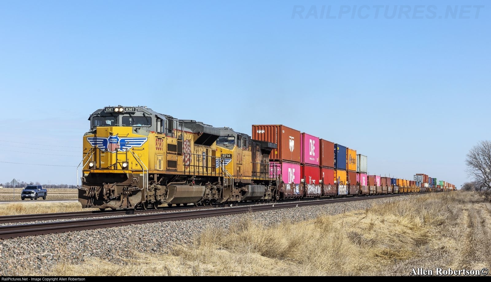 UP 8387 & 6714 power a westbound stack train.