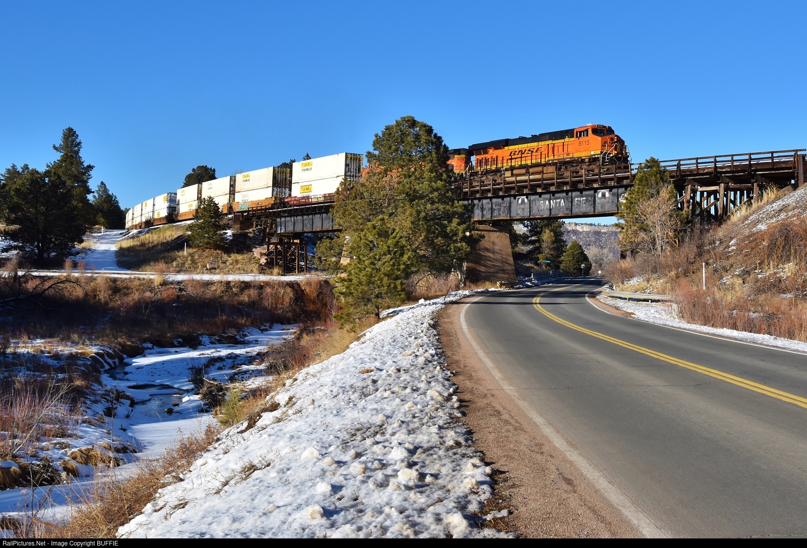 BNSF 8115 (ES44C4) leads a stack train over the Santa Fe Bridge in Larkspur, Colorado.