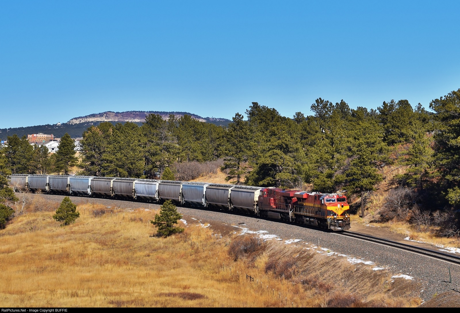 A KCS Southern Bell leads a hopper train south on the Joint Line through Monument, Colorado.
