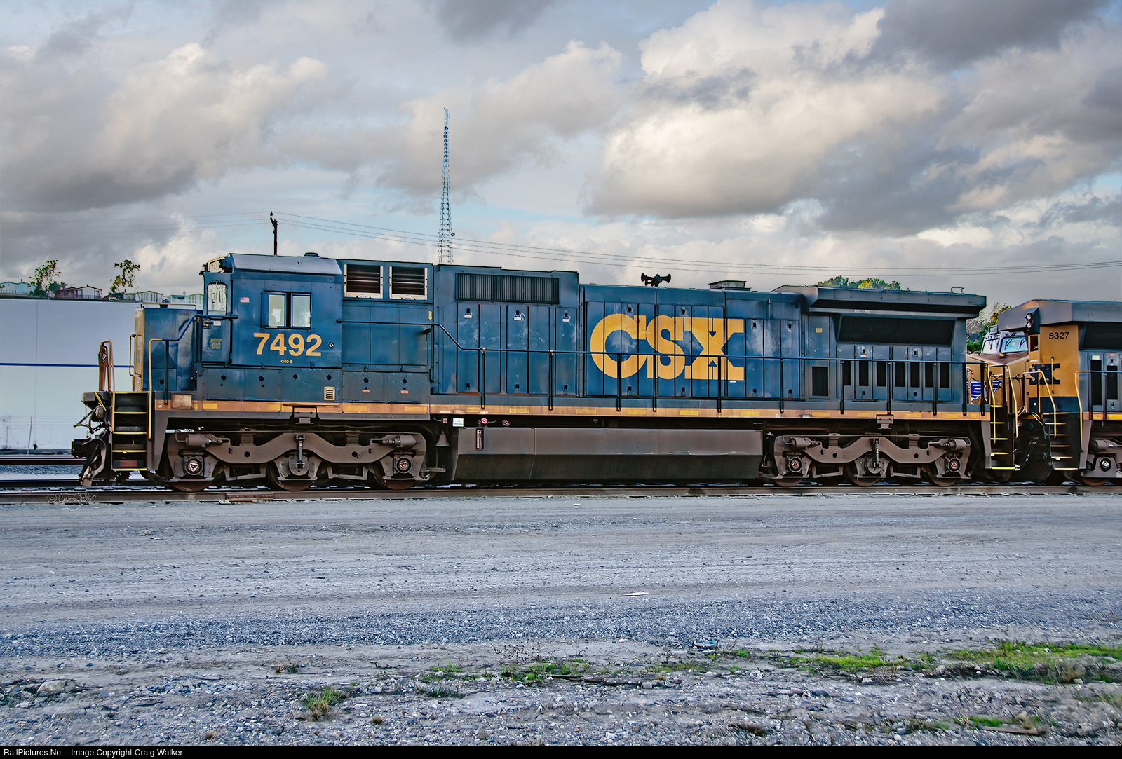 CSX Transportation Dash 8-40C 7492, seen here at Union Pacific’s Dolores Industrial Lead, was built by General Electric in March 1989 as Conrail 6037. When Conrail was broken up between CSX and Norfolk Southern in June 1999, this was one of the diesels that became property of CSX. (Compton, California – January 17, 2014)
