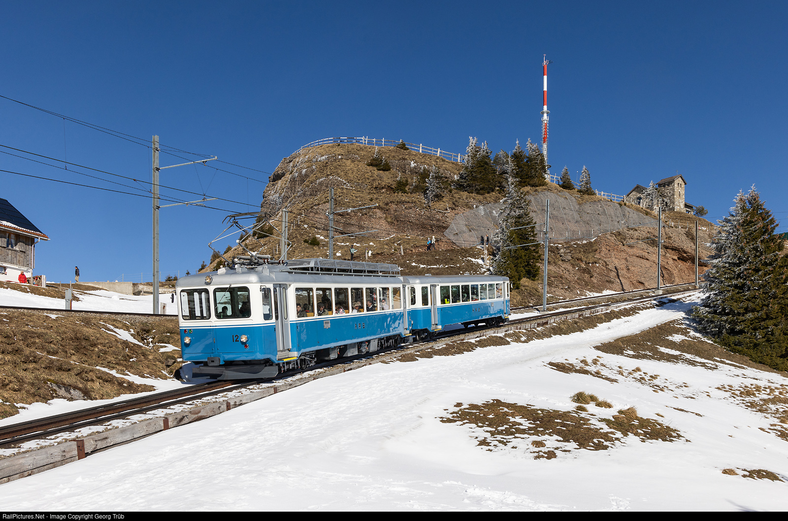 | Cogwheel push-pull train of the Rigibahnen running down below Rigi Kulm as train 152 of the line CC81. Railcar BDhe 2/4 # 12 built in 1949 and cab car Bt # 22 (1958) were brought back in the appearance of the 1960'. |