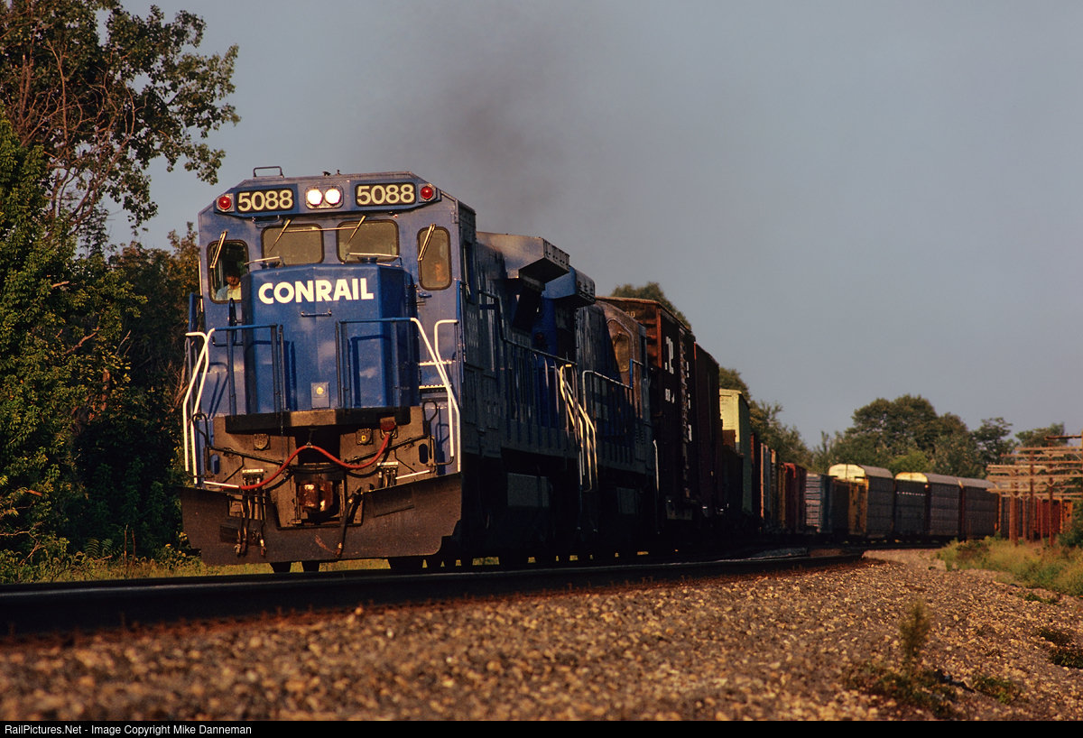 | New Conrail GE B40-8 No. 5088 leads a westbound CR freight into a setting sun at New Carlisle, Indiana, at 5:45 p.m. on September 10, 1988. |