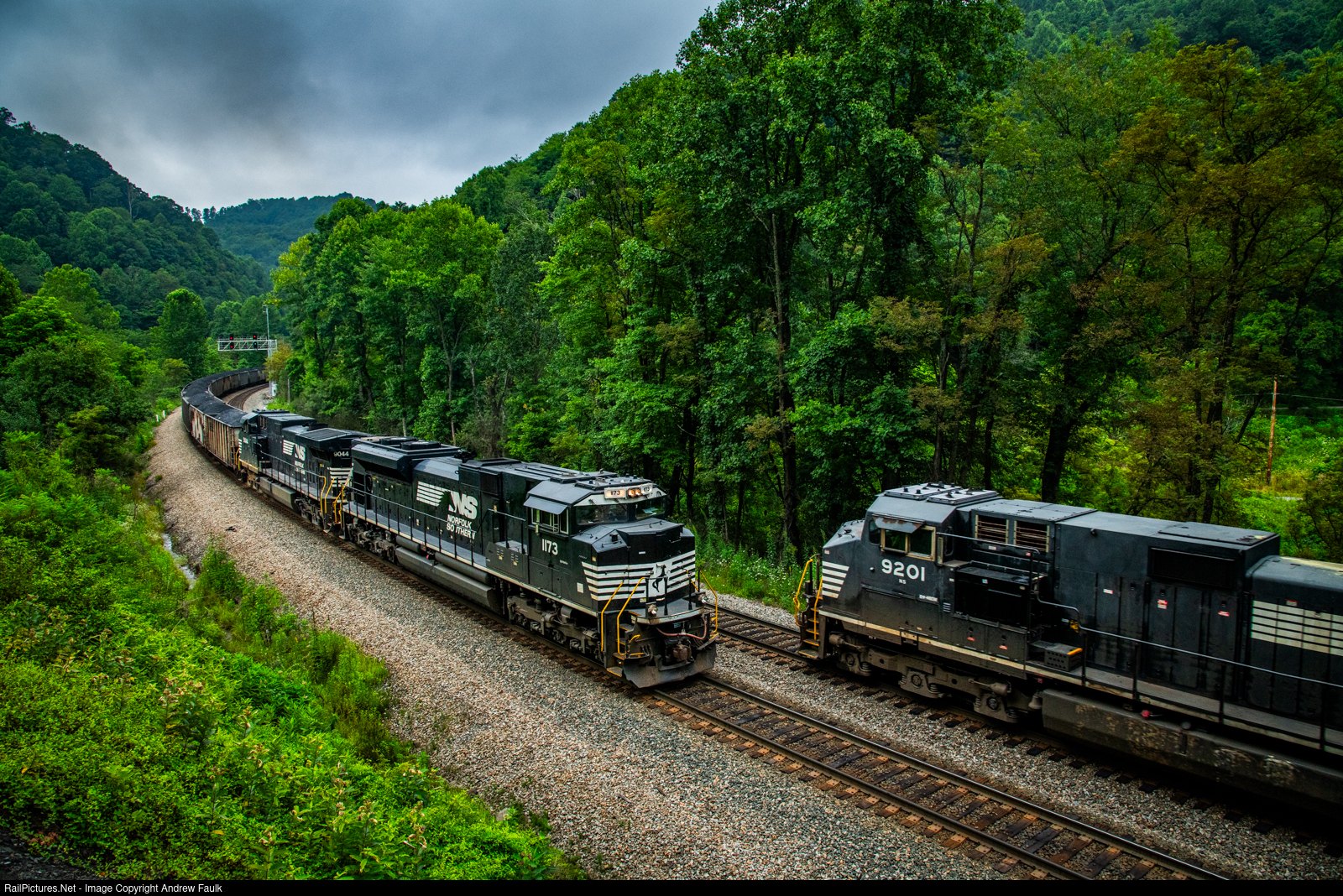 A tidewater coal train grinds upgrade at Switchback as NS 233 sails downgrade on the adjacent main.