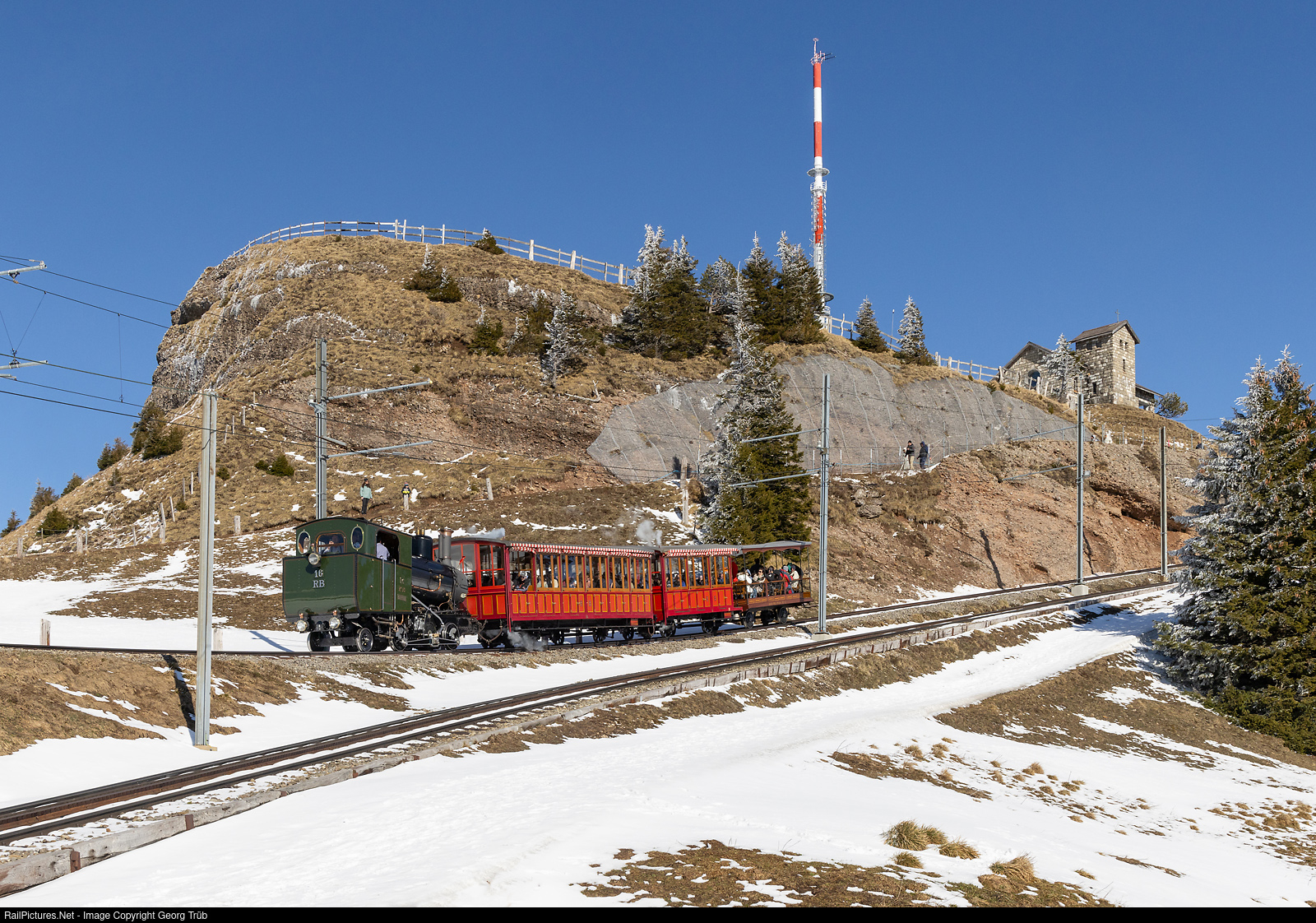| Cogwheel steamlocomotive H 2/3 # 16 of the Rigibahnen running down below Rigi Kulm with the "Winter steam special". The locomotive was built by the SLM in Winterthur in 1923 for the Rigi Bahn (RB), which was later the Vitznau-Rigi-Bahn (VRB) and now part of the Rigibahnen. |