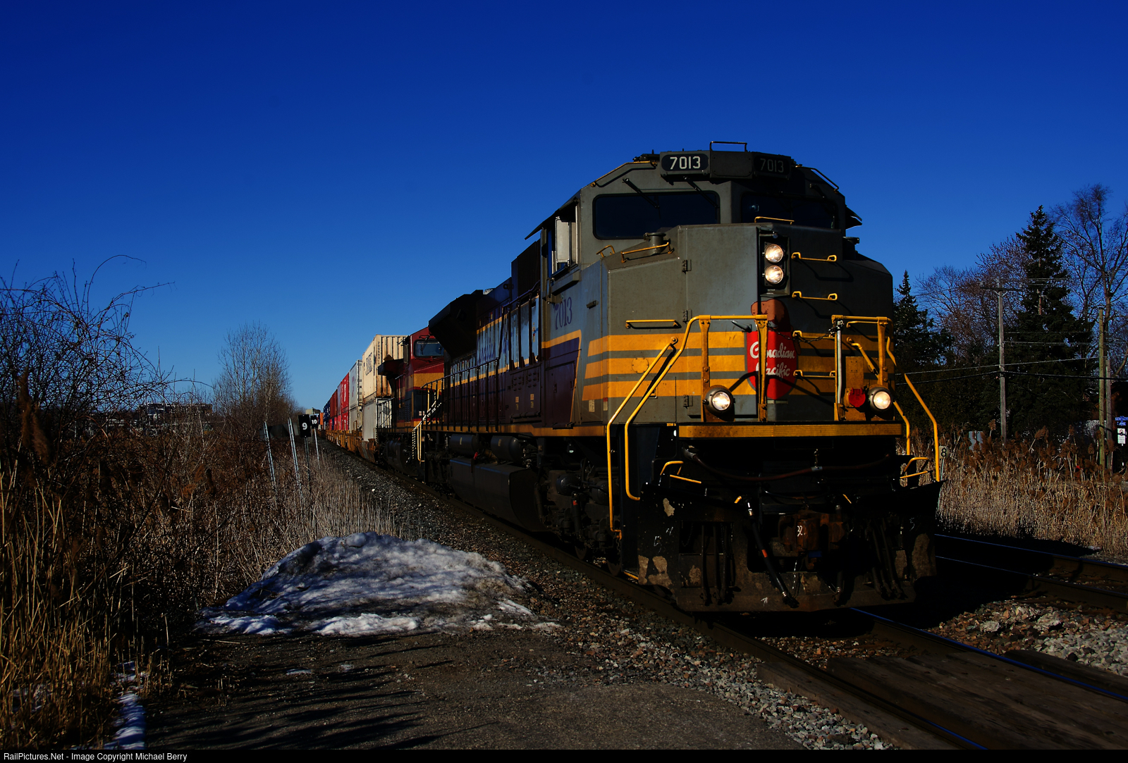 CP 2-112 is approaching Pine Beach Station with heritage unit CP 7013 and KCS 4612 up front on a cold and clear morning.