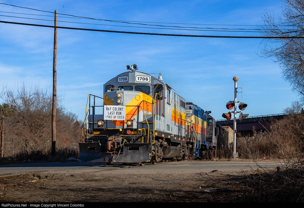 | Bay Colony 1706 and 1705 are seen at Shawmut Ave. bringing cars from interchange from New Bedford to Dartmouth. This would be Bay Colony's last run before being bought out by Mass Coastal. These two units are parked at Hyannis awaiting an unknown future. The sign was created by yours truly and mounted on the loco with permission from the crew. |