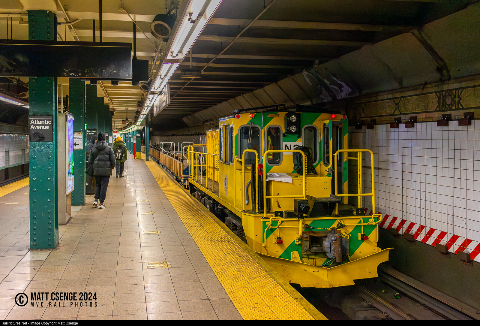 New Colors. South Brooklyn Railway (SBK) R47 locomotive N2 (GE, 1974) is seen on the north end of a work train at Atlantic Ave-Barclays Center Station on the BMT 4th Avenue Line. The SBK is a freight railroad owned by the City of New York and operated by the New York City Transit Authority, which nowadays is only used to move TA equipment onto and off the property. The SBK locomotives, N1 and N2, are the same model used by the TA, and are pooled with other TA work equipment. Until recently N2 was painted red with white stripes and bore South Brooklyn Railway logos, but now sports the same yellow and green paint scheme as other TA work equipment with only its number indicating that it is different. N1 still sports the SBK red paint, though it is very faded and is likely due for repainting.