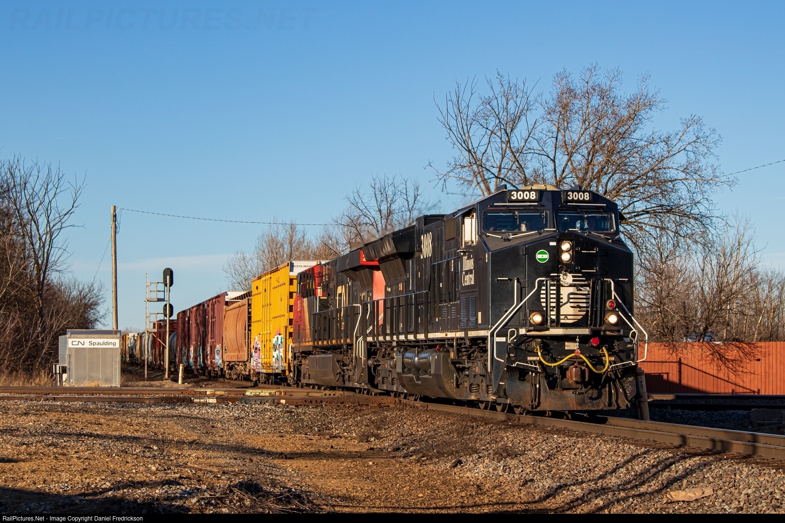 CN 3008, the Illinois Central heritage unit, leads CN M336 through the Spaulding Junction diamonds in Bartlett, IL. The unit had previously led CN A447 to Green Bay the day prior; power on that train typically turns around to lead the next day's M336, as was the case today.