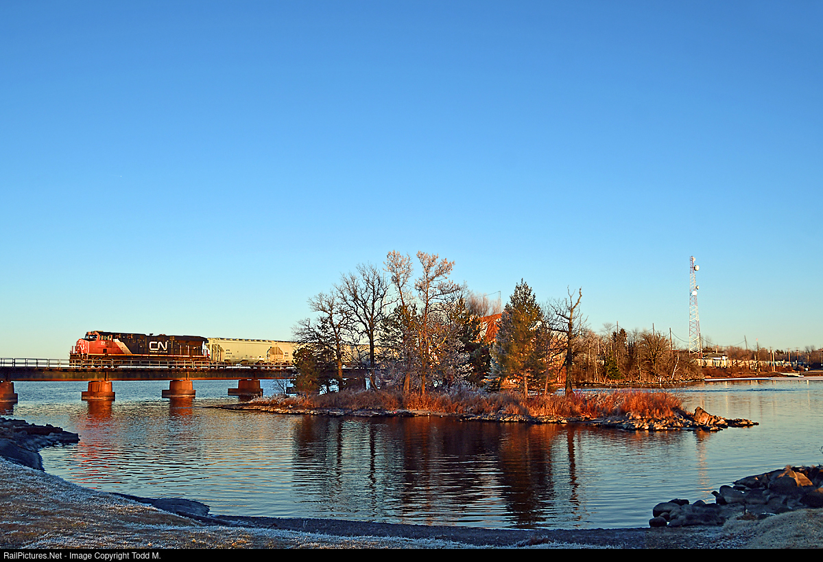Just before sunset, another CN train crosses the Rainy River between Ranier, Minnesota, and Fort Frances, Ontario as it leaves the U.S. and enters Canada.