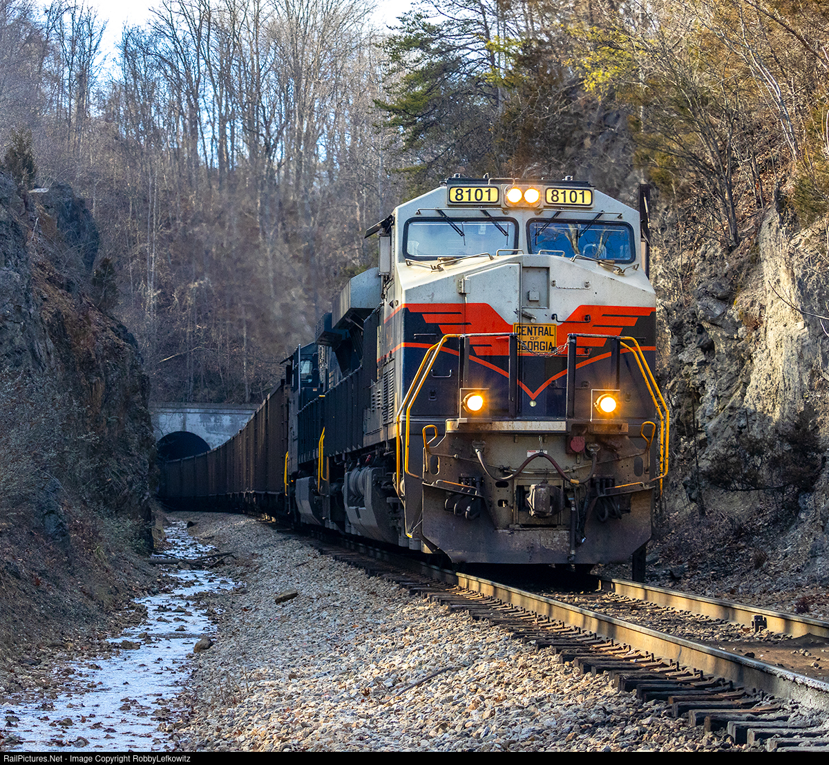 Tunnel Trek: NS 8101, the Central of Georgia Heritage Unit, leads loaded coal train NS 762 out of the Merrimac Tunnel along the NS Whitethorne District.