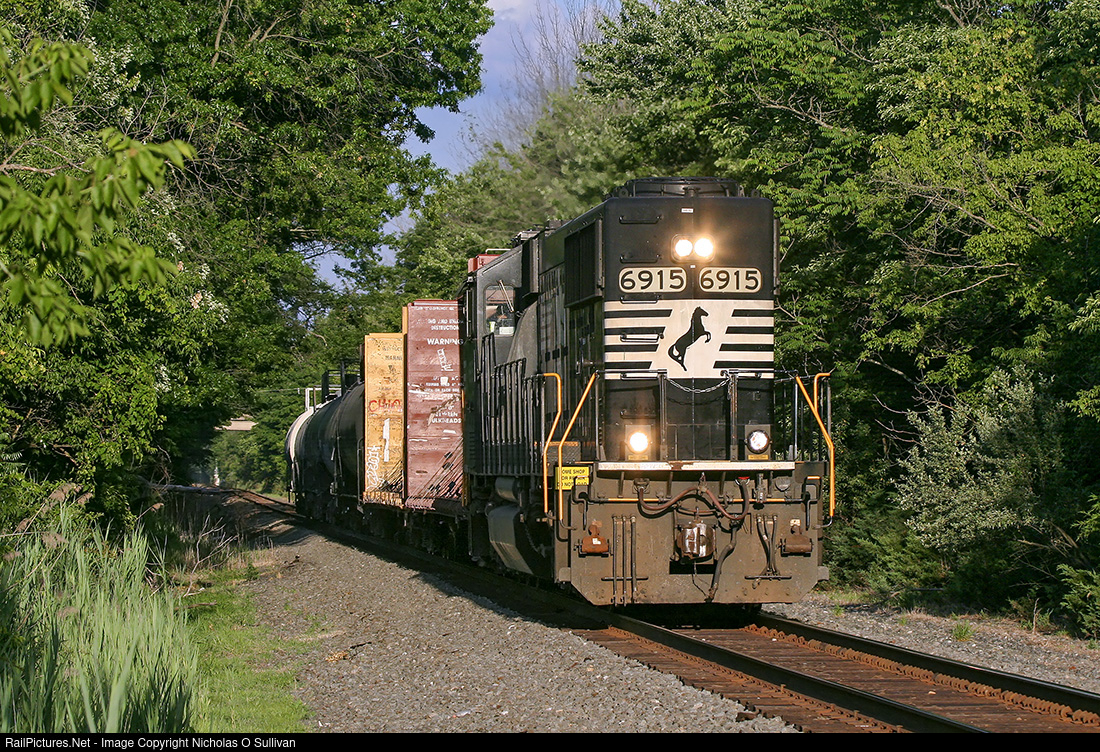 | NS H76 returns west towards Allentown Yard, PA with a rebuilt wide-cab locomotive leading long end forward. NS 6915 was rebuilt in October 2012 from SD60 NS 6599. |