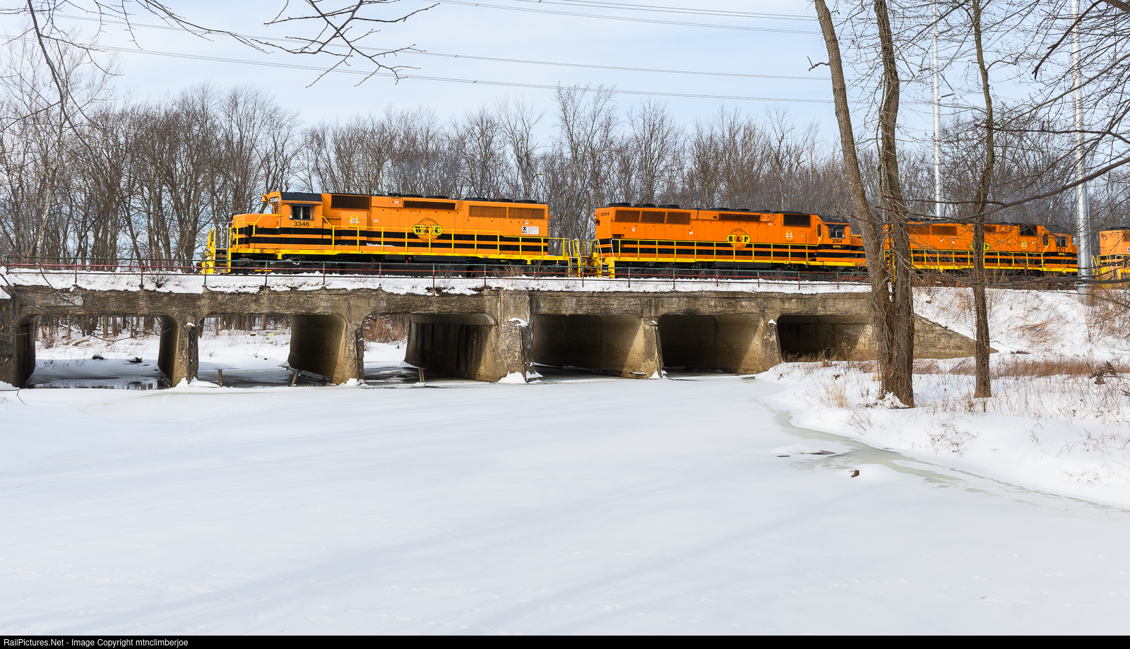 The Rochester & Southern's RS-1 departs from Brooks Ave Yard in Rochester behind a quartet of EMD's with SD40-3 3346 leading the charge as the train rolls through Genesee Junction, New York and crosses over Black Creek on a concrete bridge. This job is bound for the Norfolk Southern interchange in Silver Springs, with salt loads and manifest freight in tow.