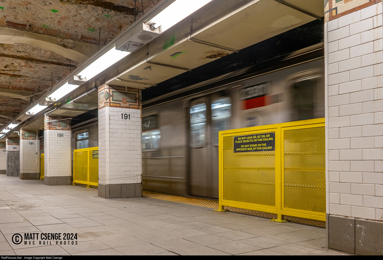 Do Not Stand on the Opposite Side of This Railing. A downtown New York City Transit Authority (NYCTA) 1 train, led by R62A no. 2301, races into 191st St Station in the IRT Broadway-7th Avenue Line in upper Manhattan. The station, which appears to currently be under renovation, is one of two where platform edge railings were recently installed - the other being Clark St Station in Brooklyn. The railings are a response to increased instances of passengers being shoved onto the tracks, and though not providing as much protection as full platform screen doors (PSDs), the railings significantly reduce the length of open platform where a person can be pushed directly onto the tracks. Though the signs warn not to stand on the track side of the railings, the railing is not at the immediate platform edge, instead being over a foot away behind the tactile edge strip. The Transit Authority released a study finding that full PSDs are not feasible at many stations in the subway system, and is also moving forward with test installations of PSDs at three subway stations.