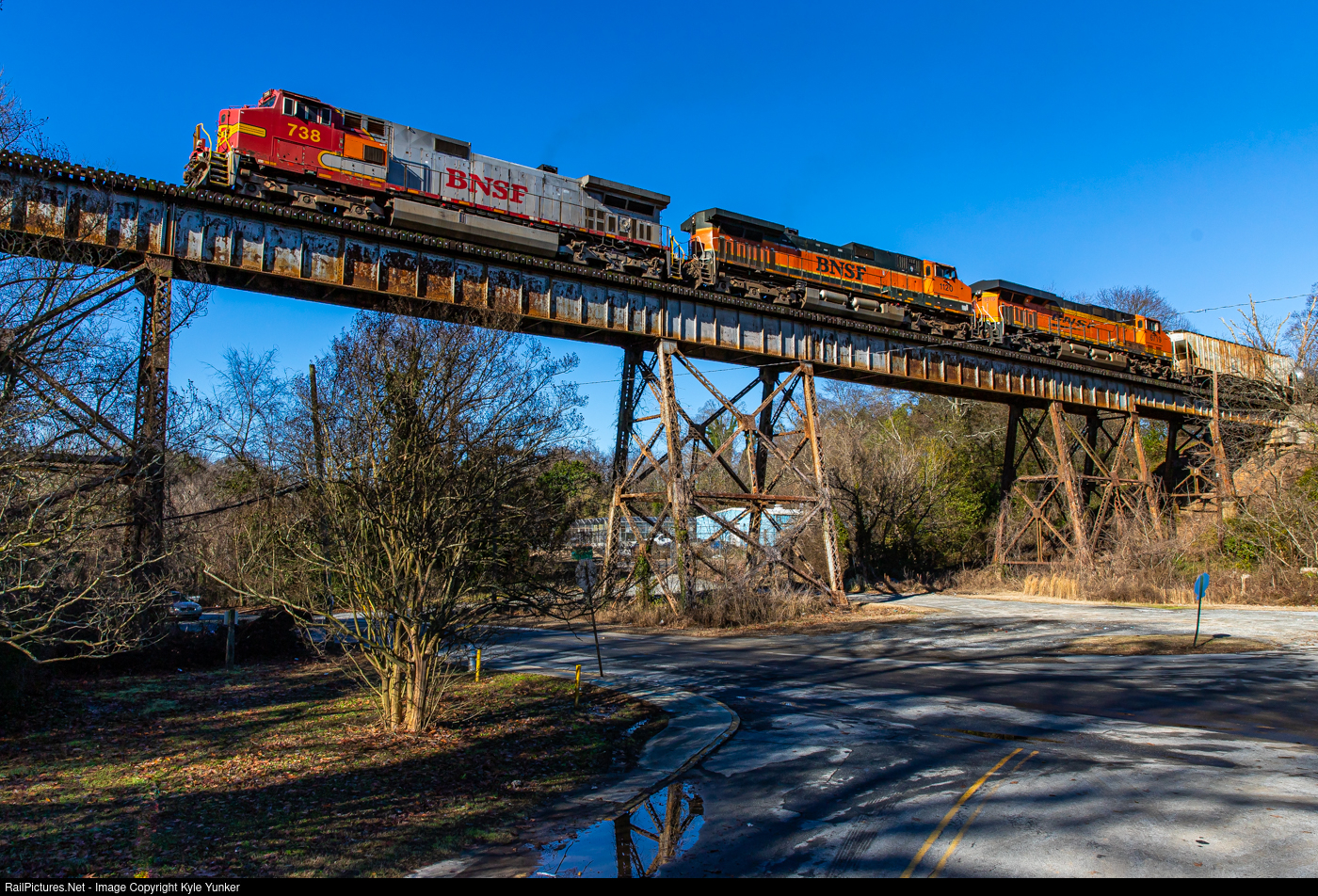 | A colorful trio of BNSF GE's ease across the ex ACL bridge south of Maddox Park leading Tampa, FL bound ethanol train B631 out of Atlanta, GA. |