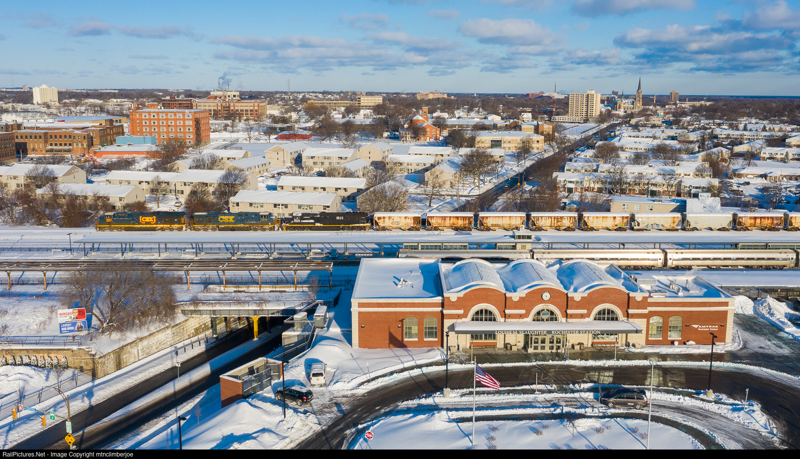 CSX's Selkirk to Buffalo manifest Q627 has completed its work at Goodman Street and departs west from Rochester, New York, passing by the Louise M. Slaughter Amtrak Station, where an Empire Service train is making its stop. Q627 picked up a block of cars interchanged from the Rochester & Southern, which includes the loaded salt hoppers on the head end of the train, as well as the Illinois Central SD70, which is being returned to Canadian National after having work done by AMP.