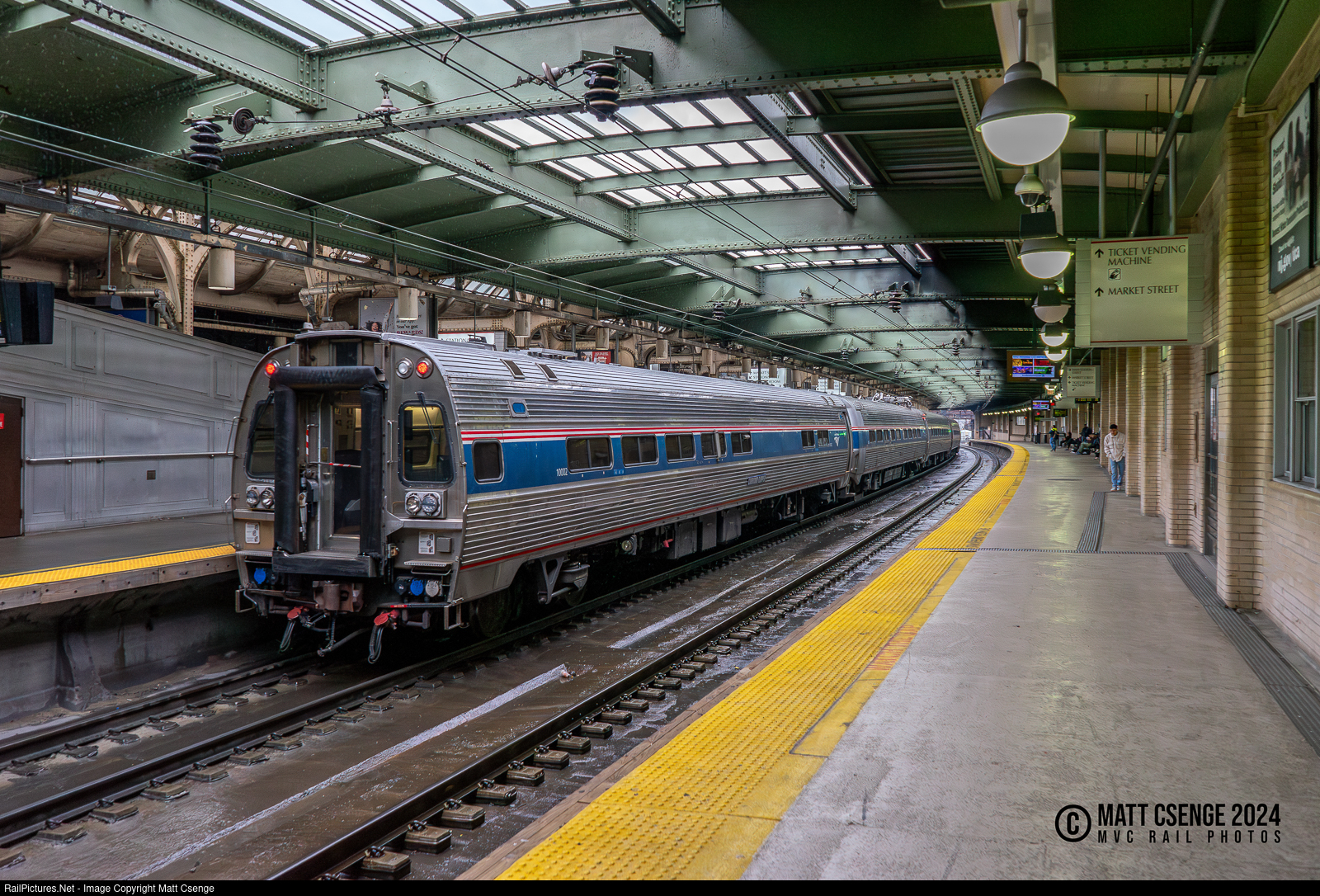 Clipper on the Corridor. Amtrak geometry inspection car 10002, the "Corridor Clipper" is seen on the end of Northeast Regional train 171(28) at Newark Penn Station. The car, along with catenary inspection car 10005 behind it, periodically traverse Amtrak's property inspecting track and catenary geometry on the fly. No. 10005 was originally a Metroliner Metro Club car, ordered by the Pennsylvania Railroad and delivered as Penn Central 884 (designated MPP85E5 by the PRR, designated MG1A by PC). It is the last active Metro Club car of the 10 built.