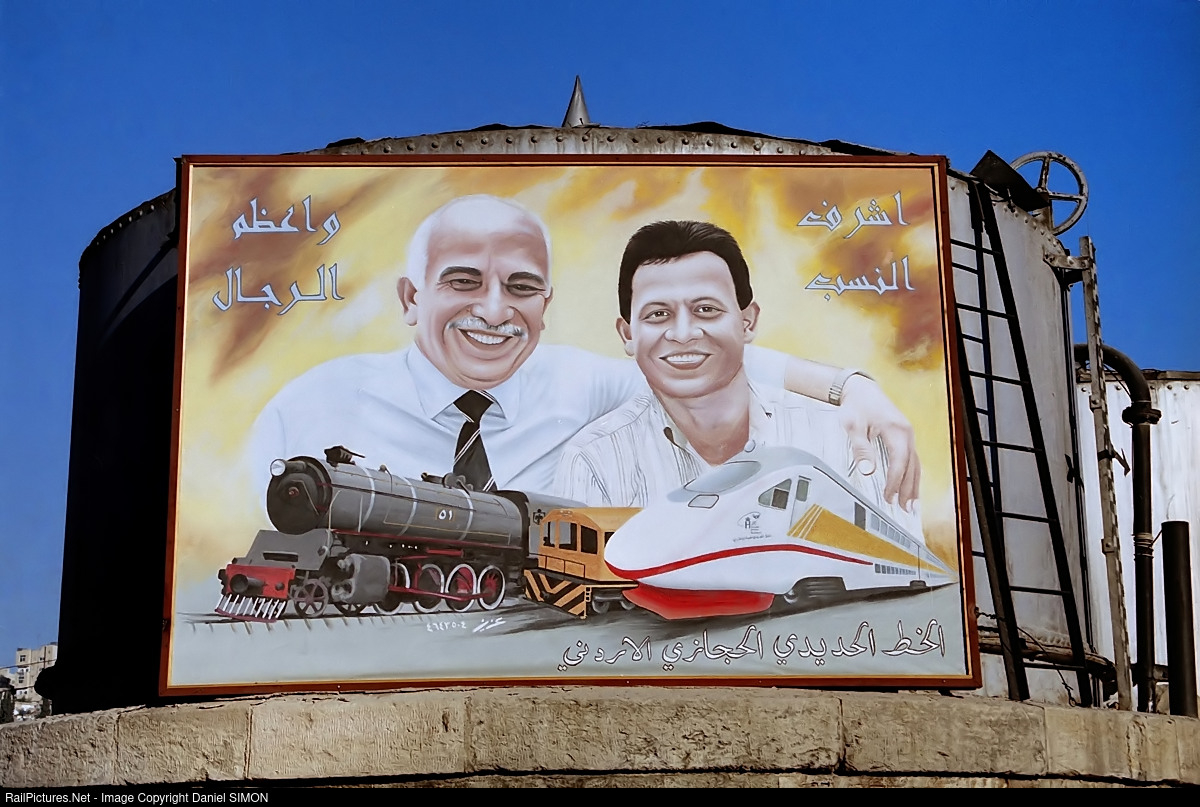 | This large painting on the water tower of Amman's steam shed depicts two Kings of Jordan (Hussein and his son Abdullah II) as well as ancient and modern rail vehicles. As far as I know, the modern railcar is pure fiction and has never been used on Jordanian rails. |
