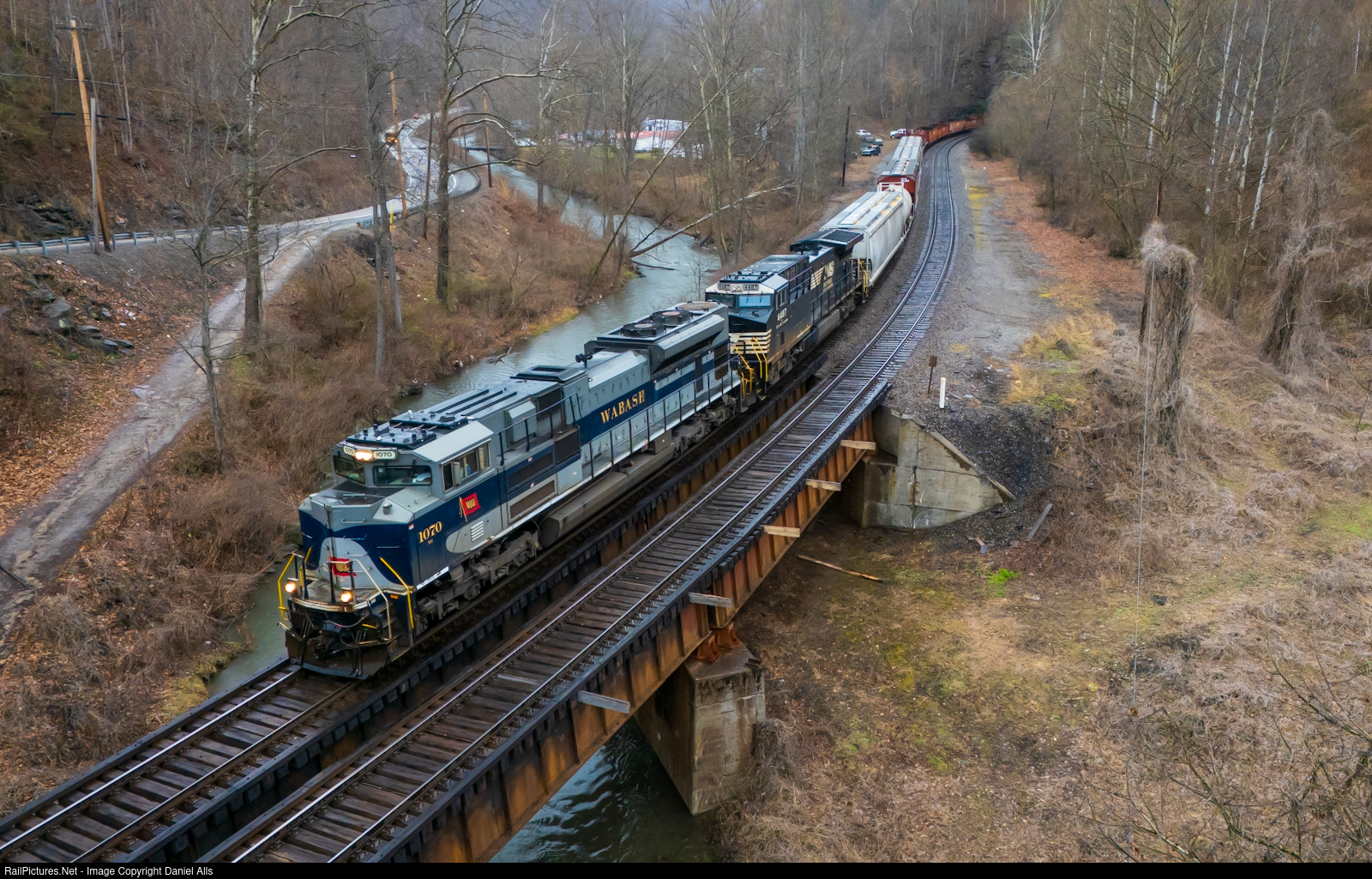 The Wabash heritage unit passes over Elkhorne Creek in Kimball, WV with NS 119.
