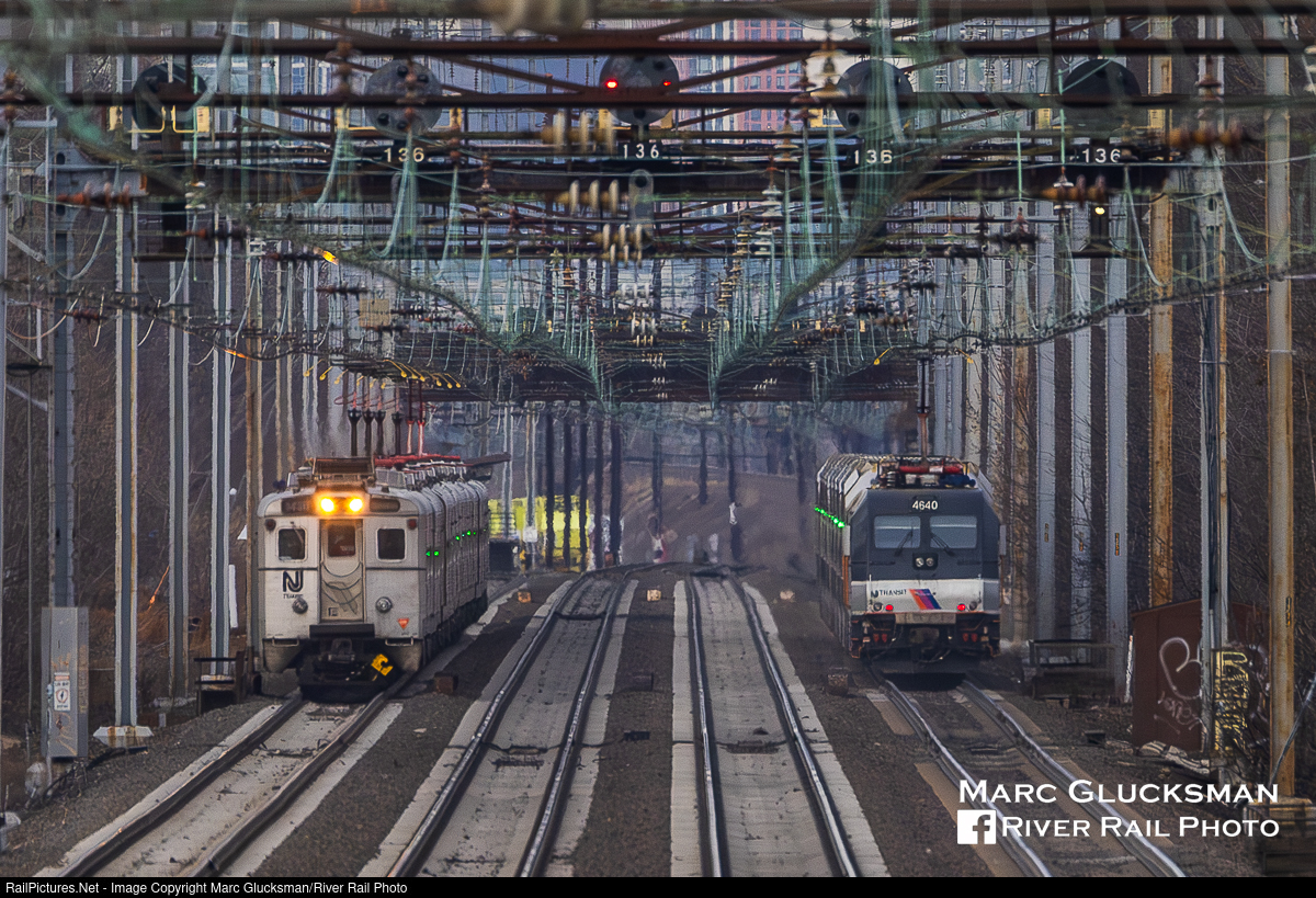 Disco Era Meet. NJ TRANSIT Trains NJT 3260 with ALP-46A NJTR 4640 (40th Anniversary/"Disco") and NJT 3723 with Arrow III NJTR 1436 had a passing meet north/east of the Elizabeth, New Jersey Station on the evening of Friday, March 1, 2024. The Arrow IIIs were actually delivered from manufacturer General Electric in 1977/1978, prior to the creation of NJ Transit when NJTDOT was still contracting with Conrail to operate passenger service. But subsequent to NJ Transit's creation in 1979, the cars were re-lettered with the NJT name and tri-colored "disco stripe" logo. In 2023, this ALP-46A was repainted for NJT's 40th anniversary of assuming operation of all commuter rail service to resemble to the electric locomotive paint scheme of that era for the General Electric built E60s that was later also worn by the ALP-44 class.