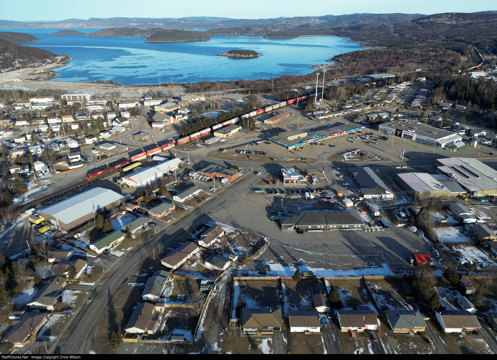 Peninsula Harbour & Lake Superior are like glass as a pair of CP ES44AC's haul eastbound stacks through the town of Marathon. This is winter and we have had very little snow thanks to El Nino!