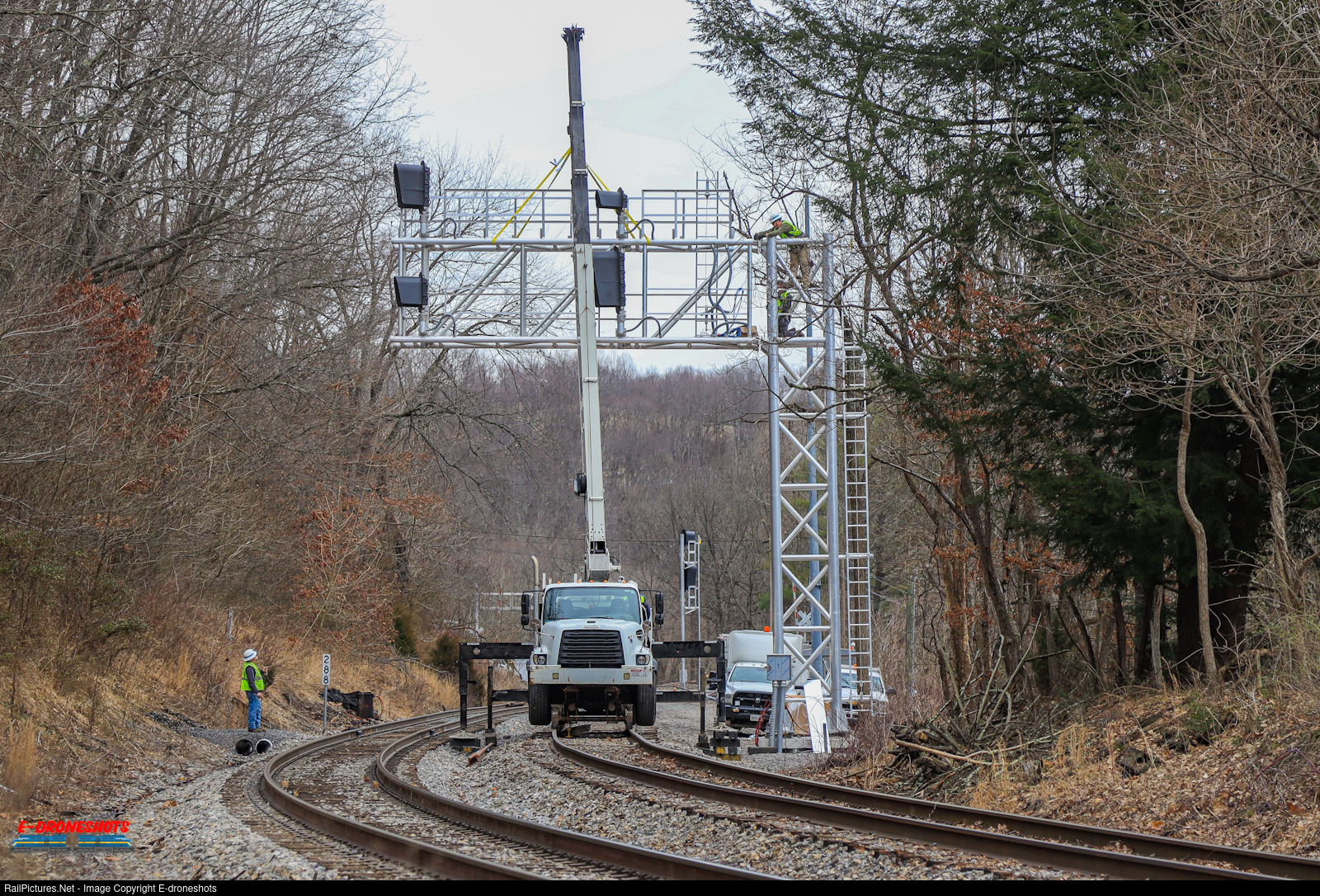 After the decision was made a few years ago to take track #2 out of service between RS tower and Berkeley run Junction, we now see the new regime of management trying to recover from pasts decisions that were made that impact operations. After 2 track was taken OOS, they began pulling up the rail to move elsewhere on the system. After about half of the double track section was pulled up, the rest was forgotten about. Recently, after multiple complaints and several operating restrictions due to the removal, CSX has decided to put back in service the remainder of #2 track. By adding a new turn out and signals, that is now possible. Here we see the CSX signal department hanging the new Signals for the new inerlocking at Simpson,