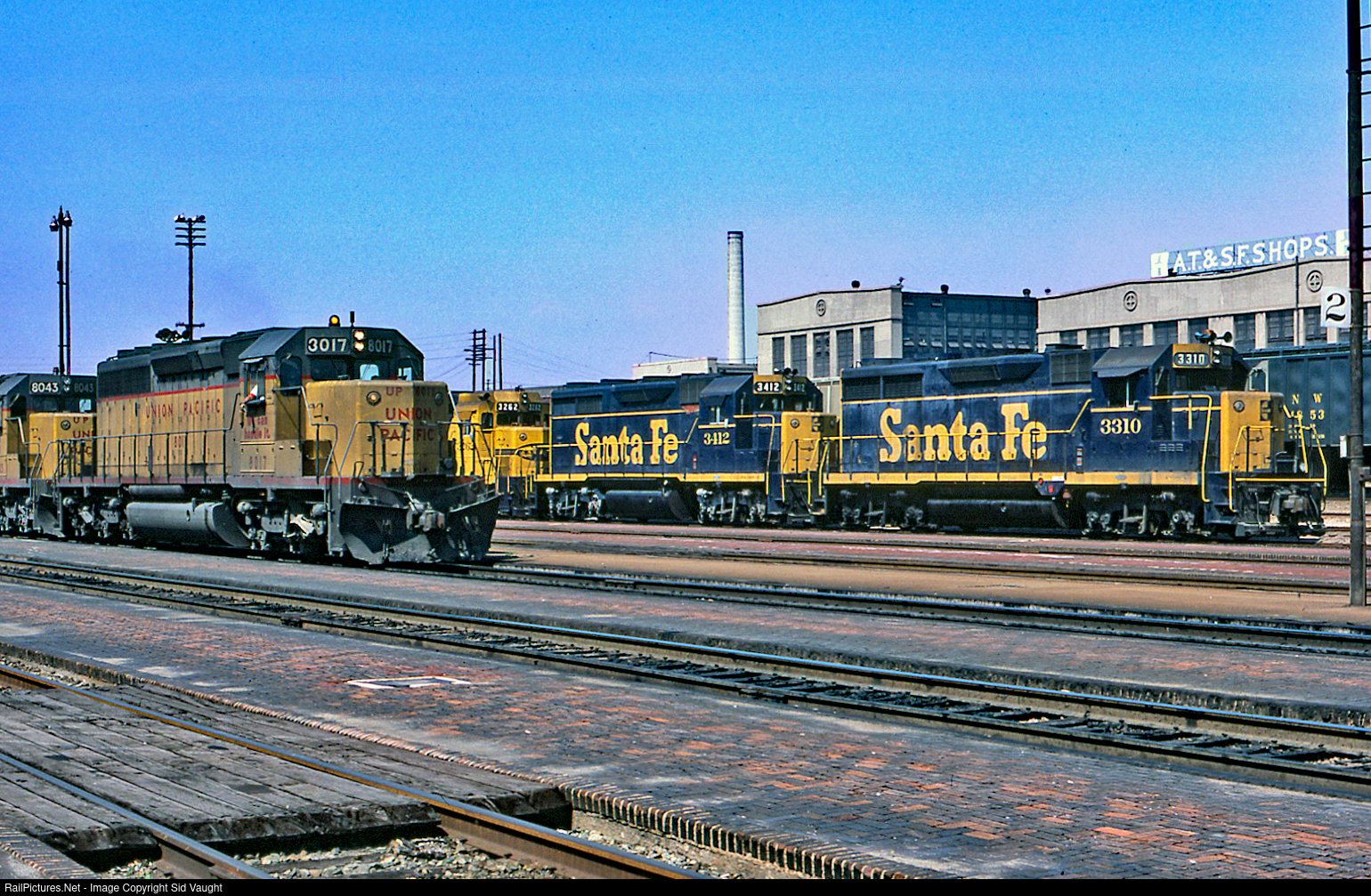 Competitors getting along together. UP's number has been modified on one side. The ATSF units are probably helpers.
