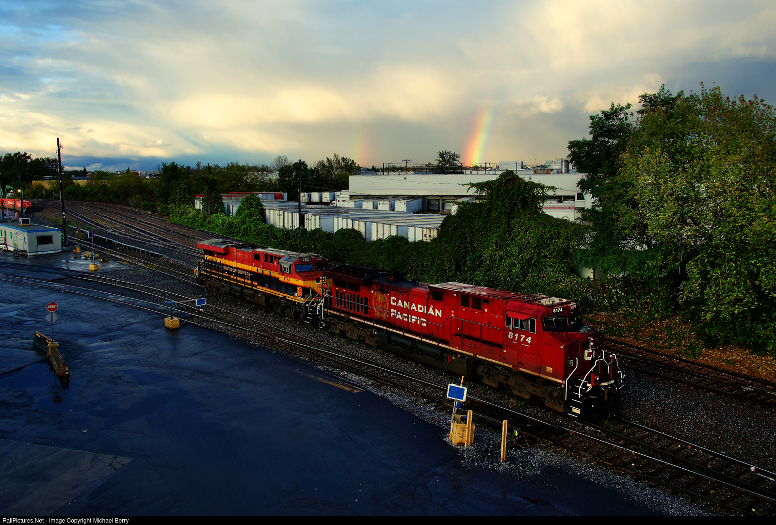 After some heavy rain, a rainbow is seen over CPKC 119's power. It is about to lift intermodal traffic from the yard.