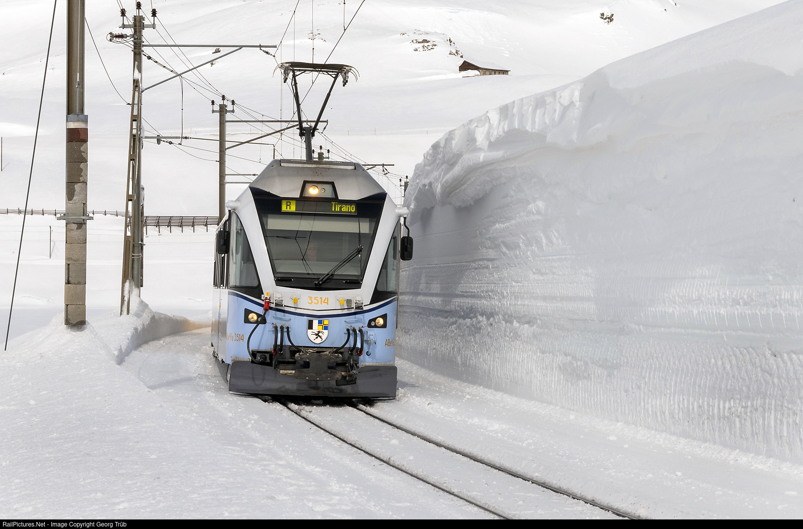 | "Ancestor train" (Ahnenzug) ABe 8/12 # 3514 of the Rhaetian Railway is rounding the curve north of Ospizio Bernina, running as regional train 4629 from St.Moritz to Tirano. The "Allegra" railcar has a height of 3,8 meter (9.8 feet), so the snow wall on the right is more then 4 meters (13 feet) high. There is currently significantly more snow in the Bernina Pass area than the long-term average. The wind from the south has piled up large snow banks here. |